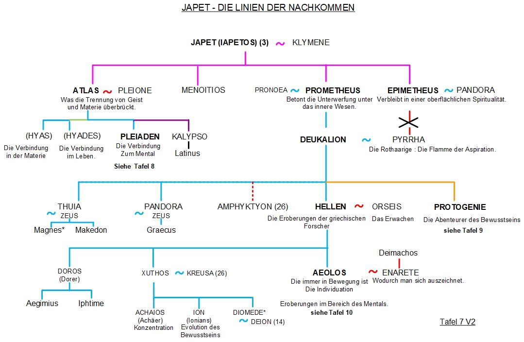 Auf dieser Seite werden die beiden Hauptlinien des Stammbaums von Iapetus vorgestellt, die von Atlas und die von Prometheus, die einerseits die sieben Ebenen des geistigen Bewusstseins und andererseits die wichtigsten Erfahrungen und Erkenntnisse beschreiben, die der Suchende beim Aufstieg auf diesen Ebenen macht.