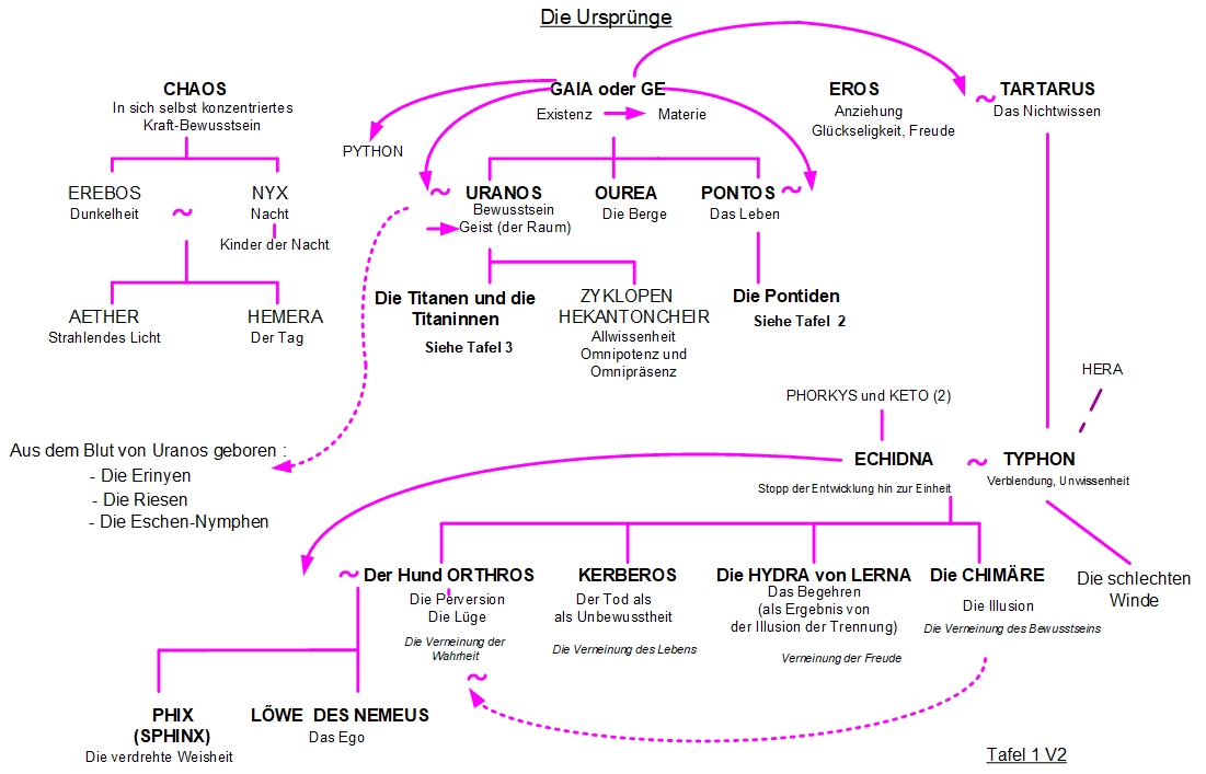 Gaia gebar dann Pontus, das Leben – siehe Stammbaum 2 -, und Urea „die hohen Berge“, die es der Menschheit ermöglichen, die Vereinigung mit dem Göttlichen im Geist zu erreichen.