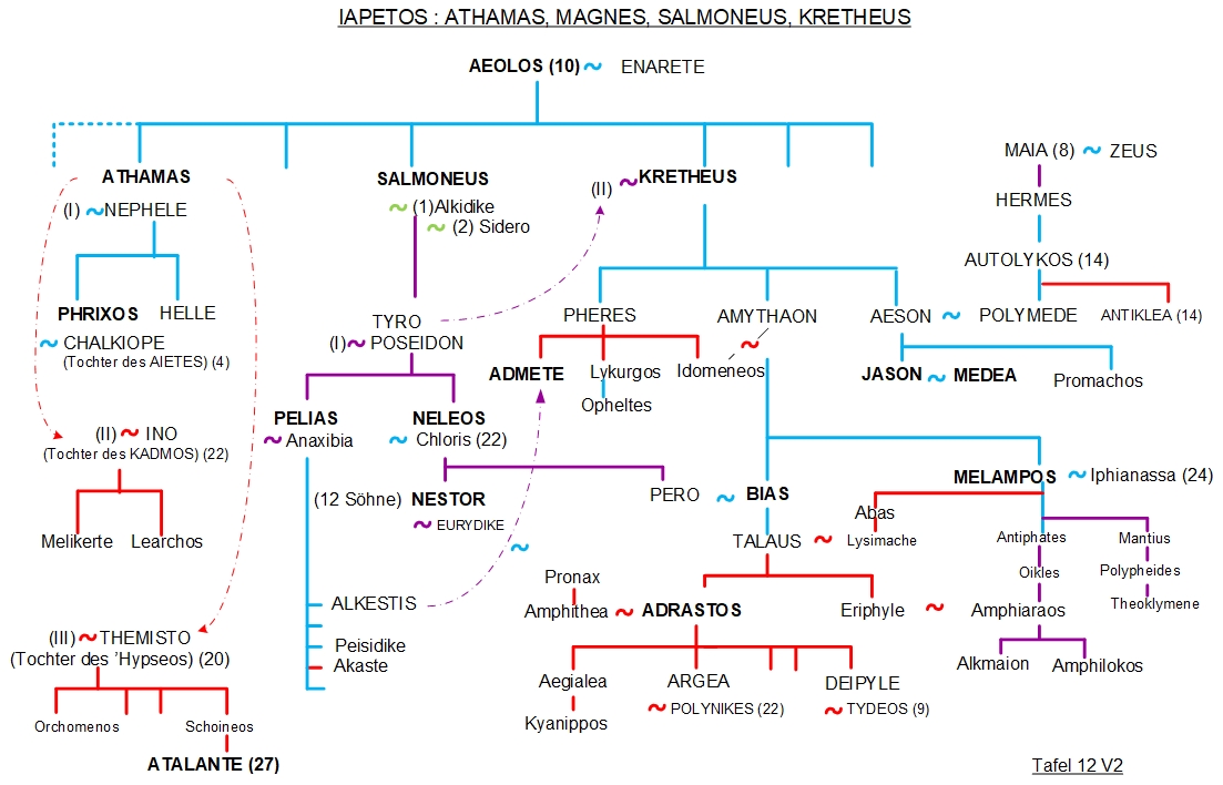 Die Abstammungslinien der beiden anderen Kinder des Aeolus, Perieres und Deioneus, sind in Stammbaum 13 bzw. Stammbaum 14 dargestellt.