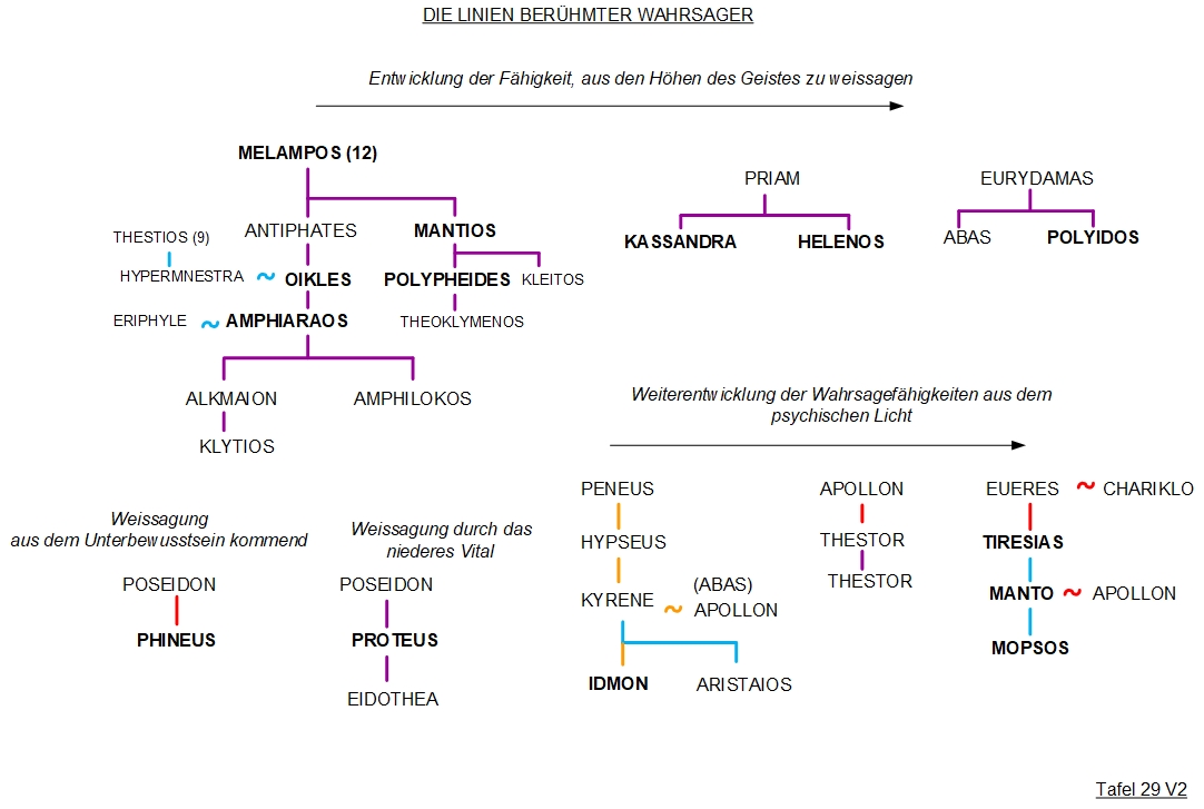 Die obigen Genealogien zeigen die verschiedenen Kategorien von Wahrsagern oder Sehern, die in der griechischen Mythologie vorkommen und die den verschiedenen Stufen des Fortschritts des Suchenden entsprechen.